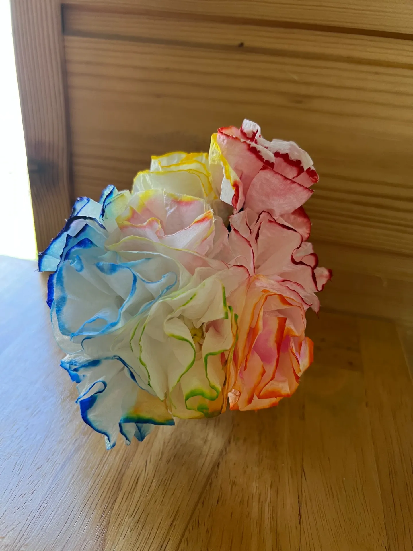 紙皿に色とりどりの折り紙を貼り付け、お母さんにメッセージを書きました☆