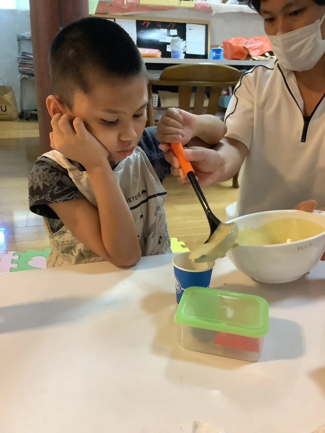 今回のおやつ作りは、「抹茶豆乳蒸しパン」を作りました😉